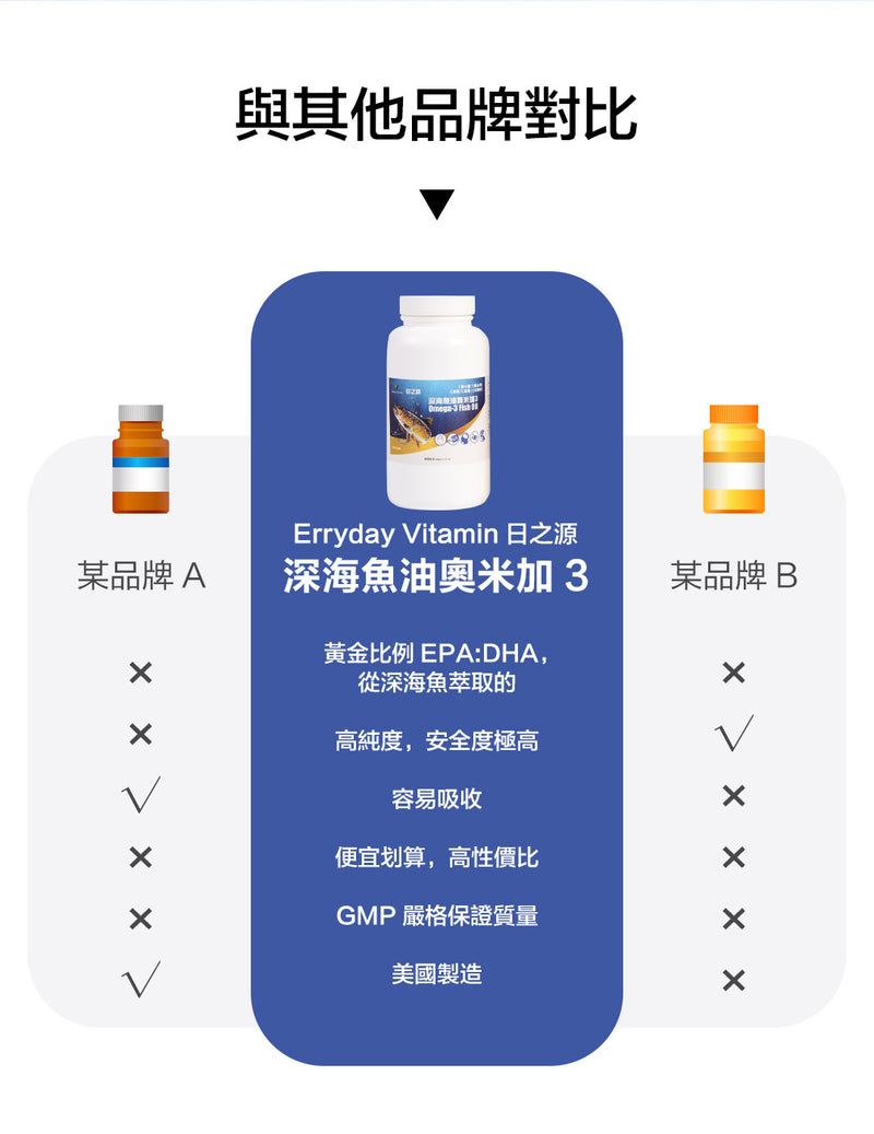 Erryday Vitamin日之源 深海魚油奧米加3產品,由美國製造,獲cGMP認證。