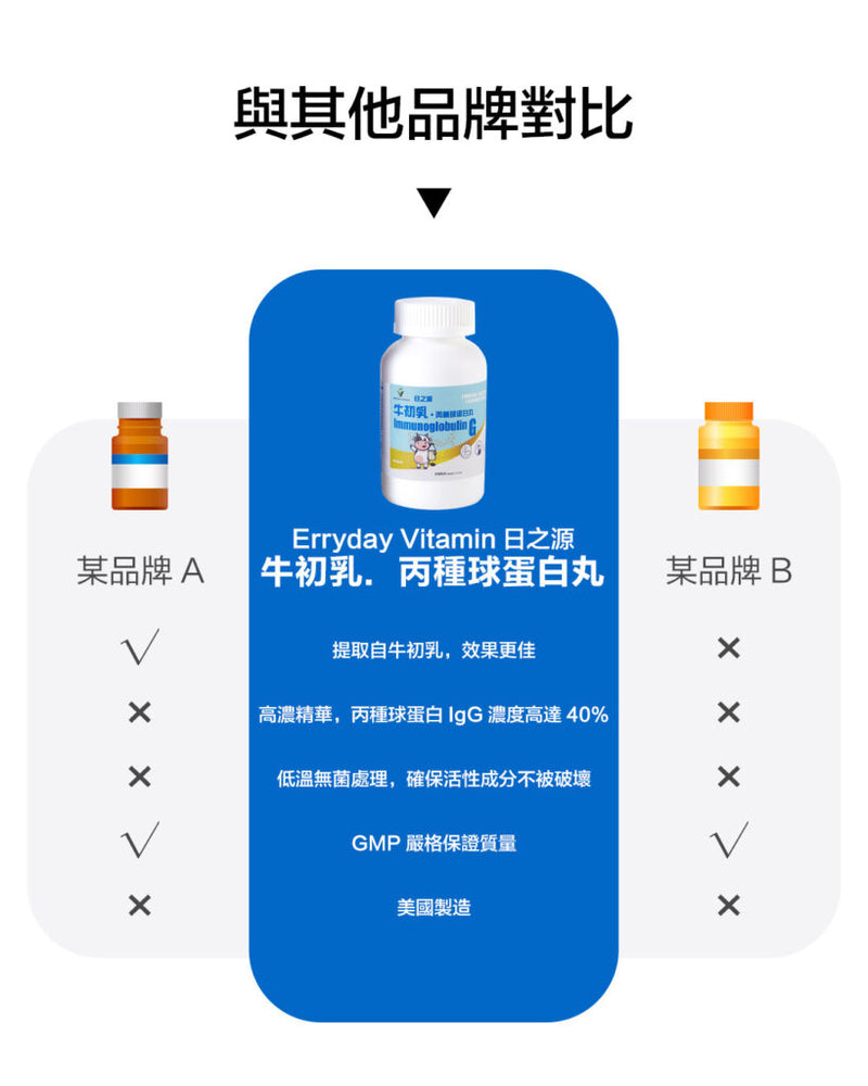 Erryday Vitamin日之源 牛初乳.丙種球蛋白丸,由美國製造,獲cGMP認證。